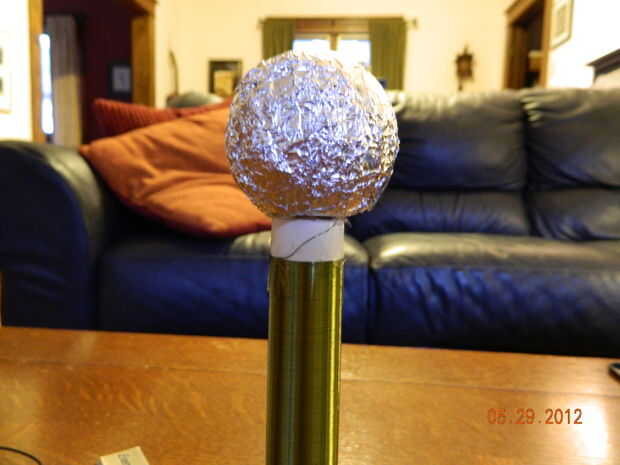 Carga superior no necesita ser elegante, una bola de metal sería lo ideal pero bastante mucho cualquier cosa redonda o toroidal en forma funcionará como está cubierto en algo metálico. Usé una perilla de madera que encontré en una tienda de piezas y envuelto en una hoja de papel de aluminio alrededor de él. Necesitará fijar un extremo de la bobina secundaria a la superior carga por tornillo o soldadura. Simplemente coloque la carga superior a la secundaria, he utilizado pegamento caliente para mantenerla en su lugar.
