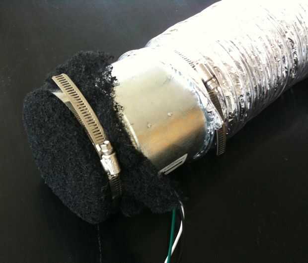 El ventilador debe tener la dirección del flujo de aire indicada en él en algún lugar, pero es una buena idea conectarlo y asegúrese de que está conectando el filtro a la salida del ventilador. Envolver el filtro sobre la salida del ventiladory seguro con la abrazadera de la manguera. Apriete la abrazadera de la manguera y tirando un poco para asegurarse de que no vendrá fuera, o permitir que el filtro de aire de escape sin ser filtrada.