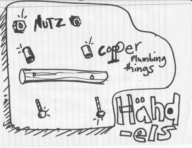 He usado unos tornillos que tenían que tener la espiga perforada para el perno al ras en vez de pegarse hacia fuera y quema mi mano. Usé algunos accesorios de tubería de cobre para la manija de la puerta del espacio. Se ve cool y no oxida como el acero.