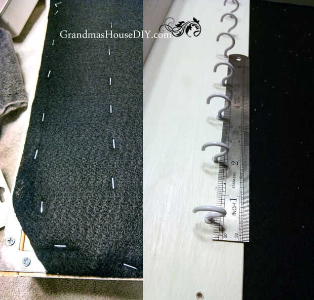 Con la caja pintada y el espejo listo para unir recogí algunos fieltro negro para la parte de atrás. Donde yo no podía de la grapa el fieltro (debido a los soportes de acero) sólo utiliza pegamento. Estiró lo apretado, atado, luego cortar la tela sobrante. A partir de ahí llegué a trabajar sumando que los pequeños ganchos para todas sus joyas. En la parte superior utilicé una regla, espaciando cada gancho de uno y medio pulgadas de una parte y luego solo un martillo y un clavo para ayudar a los ganchos de inicio, mis pulgares son todavía adoloridos por atornillar todos aquellos en pensar jeje.