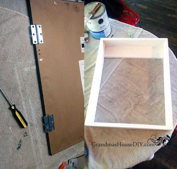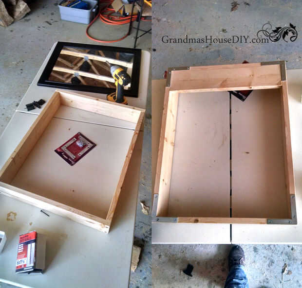 Al principio era tan simple como hacer una caja de 1x4s. He hecho la caja un toque más pequeño el espejo y había reforzada con soportes de acero para la fuerza. También he añadido el detalle de tablero en la parte superior para colgar collares de. No parecerá gran parte del gabinete de la joyería en este punto pero sabía que lo haría! Desde allí había pintado la caja y luego se puso a trabajar en el espejo. Vino con varios conjuntos de hardware en la parte trasera que se me quitan. Yo guardar los tornillos y reutilizarlos (muy con cuidado!) para atornillar las bisagras en la parte posterior. Escogí sólo pequeñas y simples bisagras para este proyecto porque el espejo no era terriblemente pesado.