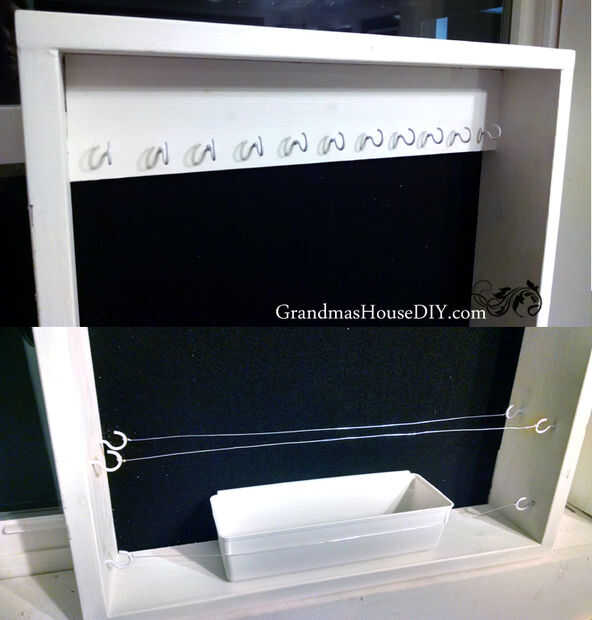 Los ganchos inferiores puse en los lados y funcionó la joyería alambre a través de para todos de sus dangly pendientes. También he añadido el cable más bajo para dar la bandeja inferior de estabilidad un poco para todas sus joyas que ella no puede colgar. La bandejita sólo recogí para menos entonces $2 también en walmart y era agradable para su joyería de gabinete porque tenía patas de goma en la parte inferior.