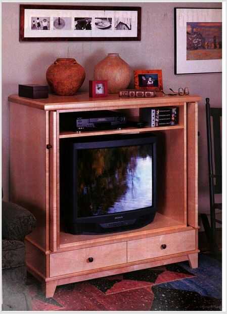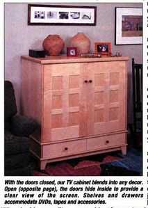 Con los aparatos más cableados a un VCR por lo menos, el hogar moderno necesita una ubicación central para todo, incluyendo un lugar para ocultar los cables y almacenar grabaciones de vídeo. Además, un gabinete independiente significa que no estamos casados con TV de este año cuando el modelo del siguiente año se ve demasiado buena para dejarla pasar. Hemos diseñado nuestro mueble de TV con espacio suficiente para un sistema típico de 27 pulg. Hay un estante de un VCR y cable o caja de satélite y dos cajones amplios para cintas y DVDs. Las puertas de frente de ancho completo en el gabinete se montan en portaobjetos retráctiles que permiten que las puertas se deslice hacia los lados caso de visión sin obstrucciones.