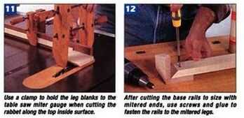 Unte el pegamento en los bordes biselados y ranuras de la placa, introduzca las placas y montar las piernas. Cuando el pegamento se haya secado, hacer los cortes angulados a cada pata de la forma cónica. Cortar los rieles de base a medida con extremos a inglete. Encolar y atornillar los rieles para las piernas (foto 12). Alesaje y avellane orificios para colocar los rieles para el caso y luego instale la base. Corte el caso detrás de una hoja de madera contrachapada de 1/2 pulgadas de espesor. Marque la ubicación del agujero de acceso de cable de 2 pulgadas de diámetro en la parte trasera y el agujero con un multispur o un pedacito de Forstner. A continuación, Monte la parte posterior a 1 - en el caso. Tornillos no. 6.