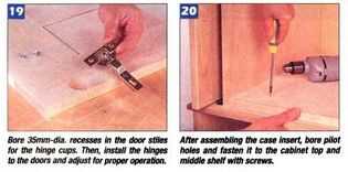 Montar las correderas siguiendo las instrucciones del fabricante. Diámetro orificios para las perillas de puertas y cajones pero no instalarlos hasta que termine el caso. Desmontar la caja y retire el hardware para el acabado. Todas las partes caso a grano 220, sacudir cuidadosamente entre granos de arena. Limpie todas las superficies con un trapo pegajoso antes de aplicar la primera capa de acabado. Aplicamos tres capas de agua blanco barniz de Behlen para restauración, siguiendo las instrucciones del fabricante. Cuando la última capa esté seca, pulir el acabado con lana de acero 4/0 y pulir con un paño suave. Finalmente, vuelva a montar el caso e instalar las puertas, cajones y herrajes.