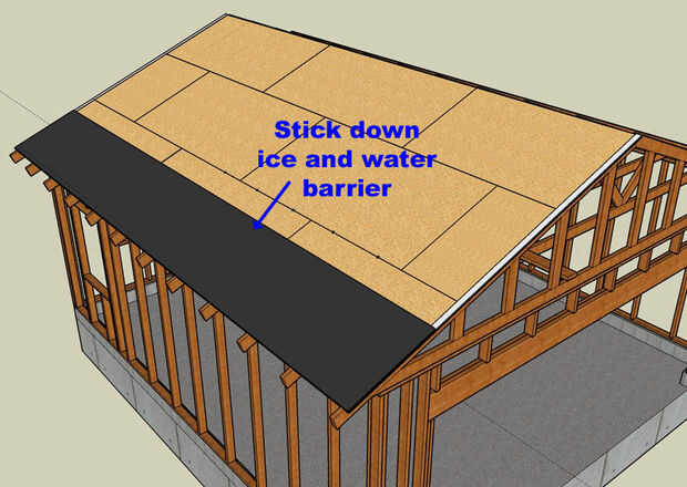 Después de instala el ribete todo alrededor, consigue una escoba y barrer el techo para quitar cualquier polvo, clavos u otros desperdicios. Esto ayuda el palillo de barrera de hielo y agua a la superficie del techo, mejora la tracción y protege el asfaltado de los daños. Entonces quieres unbox su barrera de hielo y agua e instalar a lo largo del borde inferior de los lados horizontales del techo. Estrictamente hablando esta barrera de hielo y agua sólo es necesario si usted calienta su garaje y vives en un clima frío con nieve. Calor escape a través del techo derrite la nieve que desciende a los aleros que son fríos y refreezes el agua. A presa de formas y estructuras de agua arriba y pueden penetrar en el material de cubierta. El membrana sellos clavo pinchazos y previene la infiltración del agua. Si usted vive en un clima nevado esta barrera es barato seguro contra daños por agua así que he instalado de todas formas aunque no planeo en el garaje de la calefacción. Pelar la protectora de la barrera como vas. Ayuda a dos personas. Pueden aparecer unas grapas a través del camino para ayudar a mantener en su lugar usted presione el lado pegajoso hacia el techo. Esto trabajando cerca del borde puede ser más fácil para usted desde una escalera. Desea que la barrera de hielo y agua para pegar en el borde de goteo pero no totalmente recubierto lo. Repetir la instalación en el otro lado de la cubierta. Está bien tener una costura en la barrera, se superponen los bordes cortados por un pie o tan y presione firmemente el adhesivo hacia abajo. Tenga cuidado al instalar para evitar burbujas de aire.