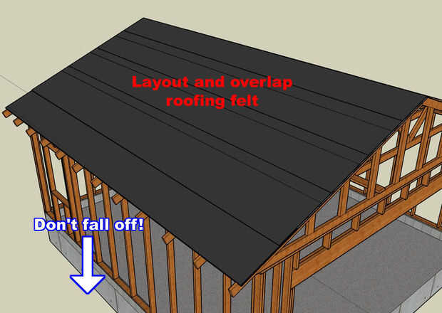 Con el techo de fieltro, resistirán algunos chaparrones en un apuro pero es el mejor plan para empujar a través del proyecto de techo todo en un solo sprint si es posible. Ver los dibujos a continuación para la clarificación de las capas implicadas en los techos.