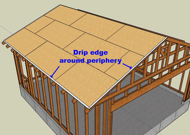 Con el garaje abajo totalmente enmarcada y cubierta, el techo forrado y los aleros y armadura de colas cortadas, podemos comenzar a cubrir el techo. El primer paso es obtener el borde de goteo D-estilo y arrastrar hacia arriba en el techo. Con 1 1/4" clavos para techo, quiere este borde todo alrededor del borde de la cubierta del clavo. Use clavos cada 12-16" o algo así. Cortar el borde de goteo de metal con un par de tijeras, que serán también muy útiles durante la instalación del revestimiento vinílico. En los extremos del faldón inclinado, asegúrese de que la pendiente superposiciones de borde de goteo goteo horizontal del borde para que agua no Haz canalizado bajo el goteo del borde y causan pudrición. También, si usted planea poner canalones en su garaje, entonces tienes que utilizar un estilo de borde diferente goteo en los bordes inferiores, horizontales. Esto se llama canal destellando o fascia o algo. Usted encontrará en el mismo lugar que el borde de goteo regular en su local del edificio centro de abastecimiento.