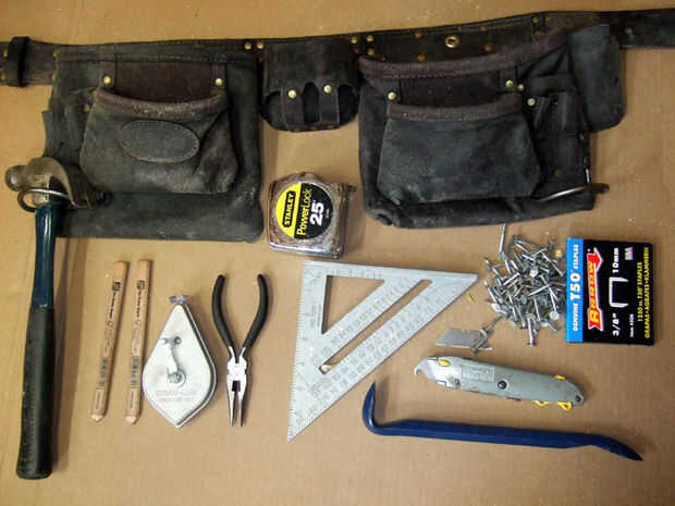 OK, antes de comenzar para techos, usted tendrá que cambiar la correa a los "techos ' configuración de foto abajo. Las diferencias principales son que ahora usted sólo necesita grapas y clavos para techo, tienes que cambiar hoja de estilos en su cuchillo, y puede ser útil tener una gato de la pata para quitar uñas sin dañar las tejas. Contrario a la foto, es útil tener dos cuchillos de techo, uno con una hoja recta estándar para asfaltado de corte y una cuchilla de gancho para tejas de corte. Otra nota, que sólo tenía una clavadora encuadre para mi proyecto y tejas a mano. Martillar los clavos de techar a mano no es demasiado malo ya que las uñas tienen una gran cabeza, son más cortos, y no que muchos clavos se utilizan. Puede rastrear una clavadora de techo sin embargo, especialmente si es muy caliente hacia fuera. Sorprendentemente, un techo cubierto de fieltro negro no es superior en ninguna lista de verano hang out puntos.