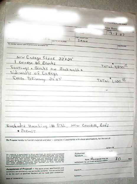 Una vez que te decides por un contratista que tendrá que firmar un contrato con ellos (a menudo incluido en la cotización) y programar su trabajo. En el caso de subcontratación de la Fundación, este trabajo fue necesario primero por lo que inició todo el proyecto y tuve que esperar antes de seguir adelante. Un contrato o presupuesto de la muestra está por debajo.