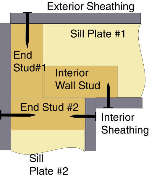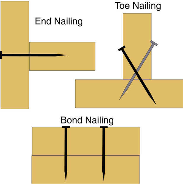 Con sus aberturas y esquinas planeadas puede cortar la madera y empezar a clavar los postes usando el clavador de poder o su propia grasa de codo a través de las placas del travesaño y la parte superior. Desea que dos clavos por conexión. Hay un par de tipos de conexión, que se llaman extremo clavado, clavado y bonos clavado de clavar. Vea el bosquejo a continuación para tener una idea de cómo estos se hacen. El único que puede ser difícil es clavos, pero usted conseguirá la caída de la misma. Para la fijación de los montantes, gato de los pernos prisioneros, rey tacos, tullidos, etc. a la placa solera y superior tendrá que pone dos clavos del final en cada viga a través de la placa como dibujado. Utilizará bond clavado para unir juntos los encabezados y para conectar el jack al rey los pernos prisioneros. Usted será también clavo final las cabeceras al rey los pernos prisioneros y los tullidos a la silla de montar. El único lugar que tienes que hacer clavado en enmarcar de la mayoría es para acoplar la silla al gato y acople a superiores lisiados a los encabezados. Ir a él.