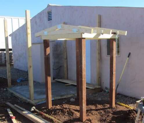Para la ubicación, el lugar más lógico parecía ser justo a un lado del nuevo porche. El cenador se sentaría en un ángulo a la residencia, kinda, sorta escondido en la esquina abierta formada por la pared del este frente de la fortaleza de la frontera y el muro norte del pórtico pronto-a-ser. El ángulo específico fue elegido por ye olde método de probado y verdadero globo ocular.