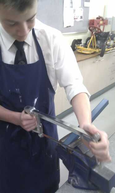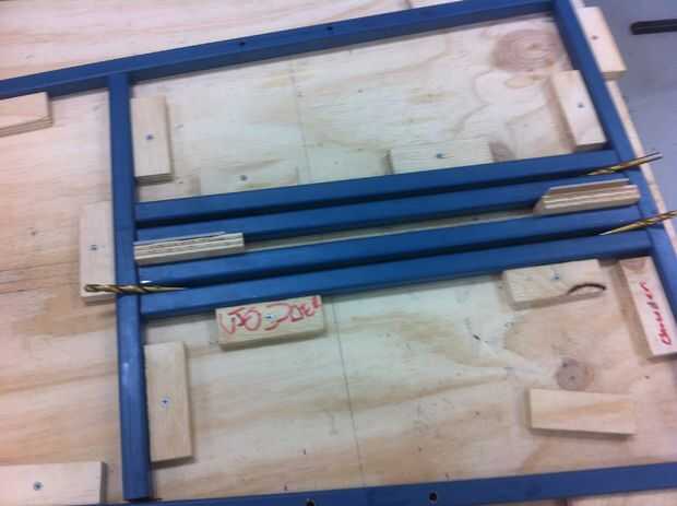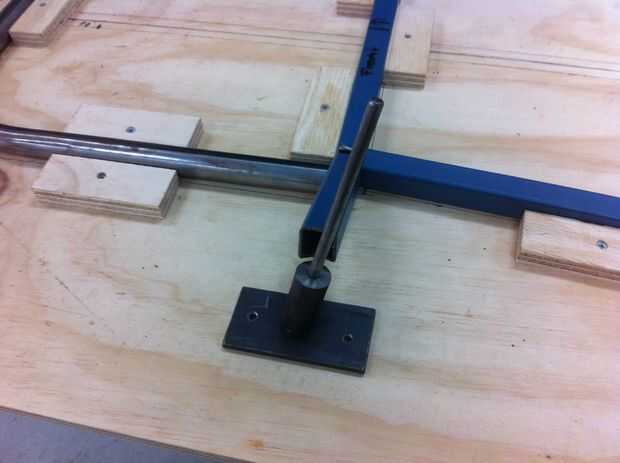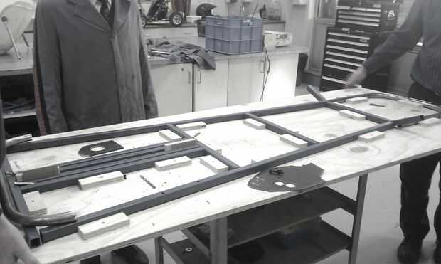 El marco fue montado en un pedazo de madera contrachapada resistente fuerte, que nos permitió pasar nuestro bosquejo de la mesa metal sobre él sin remilgos. Una vez todas las líneas, la siguiente parte era cortar el metal y colocarlos según las líneas, y luego nos jodidos algunos bloques de madera a cada lado de los tubos/varillas de metal para mantener la estructura en su lugar. Las áreas curvadas en el marco se realizaron usando un doblador de la pipa a la tubería curva, esta parte tuvo un poco de tiempo extra, como la curva tenía que ser simétrico. La siguiente parte era añadir el parachoques en la parte delantera, estos resultó más de lo que deben de porque nuestras medidas habían sido ensuciados para arriba unas cuantas veces, por lo que el tope no fue correcto, dando por resultado el pedazo entero tener que rehacer, pero terminó bien.