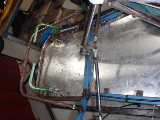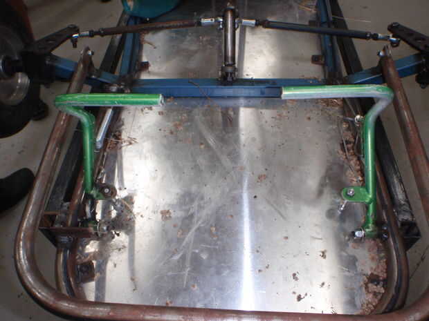 Go-Kart necesita un piso, hemos decidido hacer nuestro piso de una aluminio de poco grosor, se traza alrededor del frente del kart y corte con una cortadora, los filos de arena. Algo sujetar la planta a lo kart necesita soldar unas lengüetas de metal por lo que puede empernar el suelo en lugar. Es necesario hacer fichas de cerca de 10 a 12, las pestañas hacia fuera con una broca de 6mm de perforación. Después, se soldarán las lengüetas para el marco, del perno en el piso con tornillos de 6mm y tornillos nylock. No pinte el piso como se desaparecen cerca de los pedales!