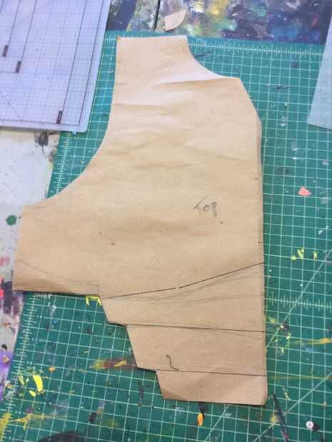 2) doblar por la mitad, dibujar en tu plantilla y luego empezar a cortar la forma general de papel doblado (Foto 1). Al desplegarlo, debe tener la pieza frontal (Foto 2). (son dos piezas diferentes de pecho, la técnica es la misma aunque)