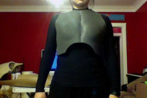 9) ahora más espuma y ponerlo en las secciones de hombro. Acaba de tomar algunos espuma extra, colocada en el espacio vacante donde la correa de hombro sería, márquelo y luego cortarlo. Pegamento en su lugar una vez terminado.