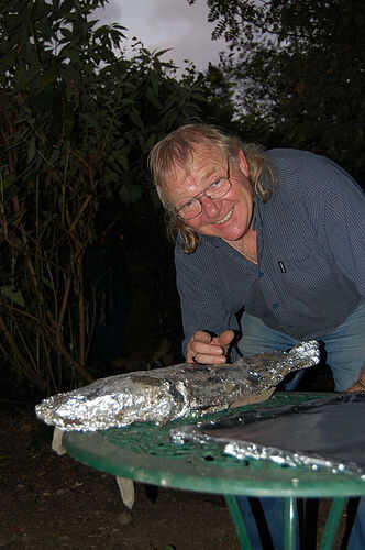 Sabíamos que Sammy era aproximadamente 4" abajo y una vez que vimos el resplandor plateado de la hoja, el resto de la extracción se hace a mano. Una vez más, tenga cuidado, que nos sorprendió lo caliente la tierra, los alimentos y las piedras seguían.