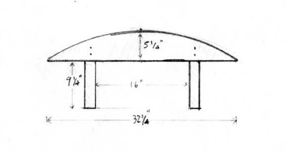 Para dibujar la curva, usted quiere saber el radio del arco que está construyendo. Después de hacer la clase de fin de semana, el instructor me dio la plantilla que hemos utilizado, pero no hay detalles sobre las dimensiones. Usando una calculadora en línea del círculo con las mediciones de la altura del Arca (5.25″) y la longitud de la cuerda (distancia en línea recta entre los dos extremos del arco; 32.25″), era capaz de determinar el radio del arco que 27.39″. Con el radio, basta con hacer una línea de esa longitud, un extremo fijo y con un lápiz unido a él y utilizar para dibujar la curvatura.