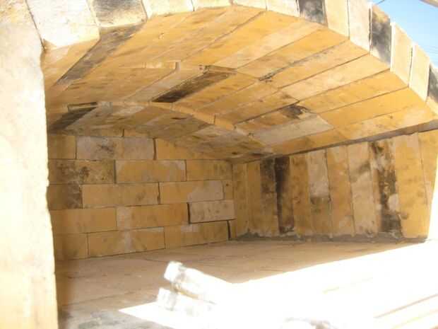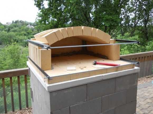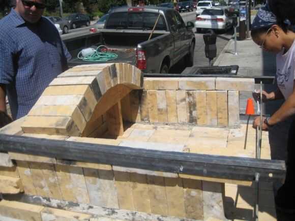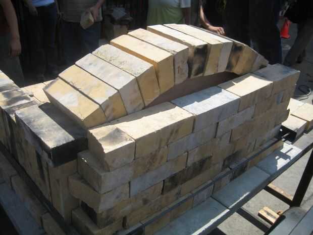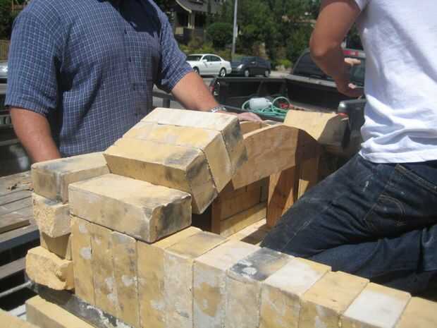 A partir de la parte exterior, añadir los ladrillos en sus costados, moviéndose hacia el interior de cada lado. El medio ladrillo (keystone) terminó por encajar perfectamente en el lugar. Romper uno de los firebricks y utilizar los fragmentos entre los huecos para evitar desplazamiento y caída durante el retiro de la plantilla.