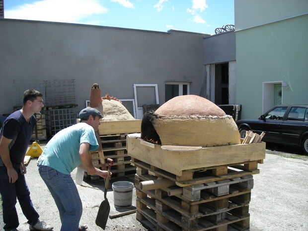 Fotos de hornos más pequeños en un taller. Uno con chimenea, en el método de montón de arena, el otro sin chimenea se hizo con el método de cesta invertida.