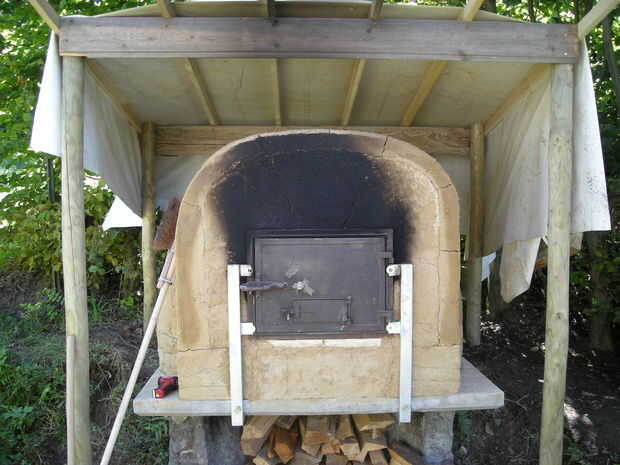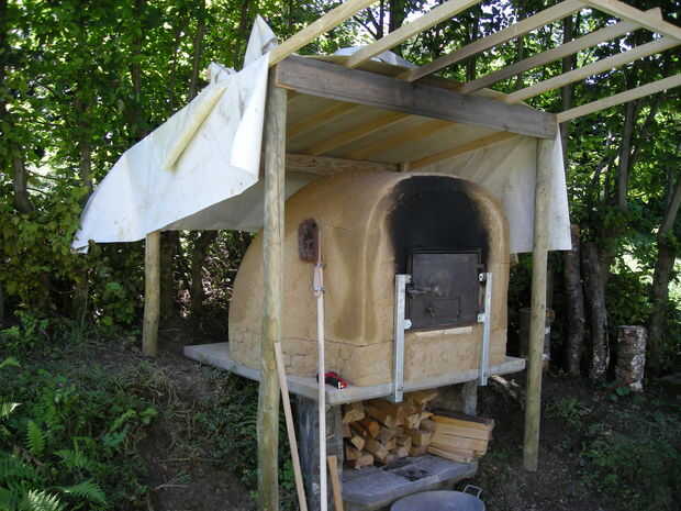 Si usted quiere hacer esto, pensar en él desde el principio. Eso significa planear sus bases un poco más amplio. Planeé mi aislamiento desde el principio, pero quería ver cómo funciona sin. Después de aplicar 8cm / 3.5inches de aislamiento de perlita y arcilla, la temperatura exterior bajó a la mitad, manteniendo el calor mucho más tiempo. Usted puede utilizar diferentes materiales para el aislamiento, mi elección fue un mineral espumado. Puede utilizar la vermiculita o pómez, pero funcionaría también aserrín grueso o paja de una motosierra. Tal vez usted necesita hacer una capa más gruesa para conseguir el mismo efecto aislante. Usé un mezclador de pintura resistente en un taladro eléctrico para mezclar agua, perlita y arcilla. Como se puede ver, roto después del secado. Se utilizó un cartucho de silicona, rellenas de arcilla algo fino para llenar las grietas. Además hicimos una cubierta temporal con la lona que utiliza para mezclar y amasar la mezcla de barro. Se hará el techo final de fibra concrete(ethernit), pero es lo utilizas. Dependiendo de la distancia de la abertura del horno, debe ser resistente al calor. Trabajado con la madera de pino y lona sin fusión o carbonización, pero voy a usar roble donde hace calor.