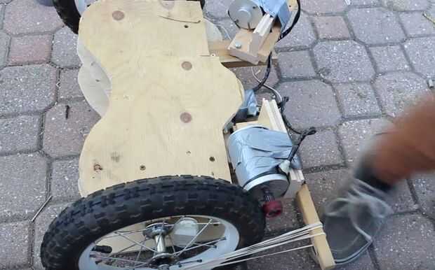 Para acabarla apagado, conecte unos elásticos del soporte del motor al eje de las ruedas. Esto hará que el motor presione contra la rueda. Si el motor no se presiona lo suficientemente duro contra la rueda para mover el boad suspender cuando usted está parado en él, añadimos más elástico a cada lado