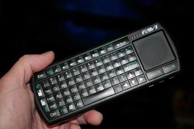 · FAVI FE02RF-BL Mini 2,4 GHz Wireless Keyboard – éste era alrededor de $30 en Amazon. Este pequeñín tiene un teclado QWERTY completo y touchpad, teclas retroiluminadas, gran conectividad para mi set up (cerca de 10' de máximo entre sofá y receptor). Tuve que mover el receptor USB desde el HTPC hasta el concentrador USB para obtener la mejor recepción (me pregunto si en la rejilla metálica que estoy usando mal estado con la recepción). Duración de la batería es de 3 a 4 semanas antes de que necesite recargar. Es muy fácil de pulgar tipo, gran retroalimentación táctil. Revisa los comentarios en línea sobre estos. Definitivamente te recomiendo conseguir uno de estos para un HTPC.