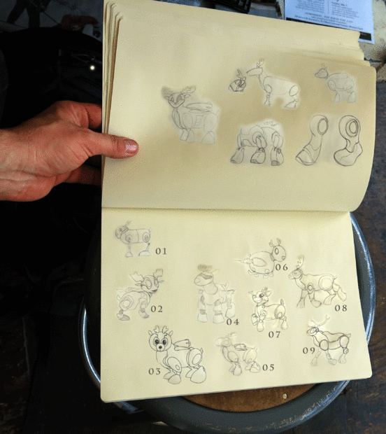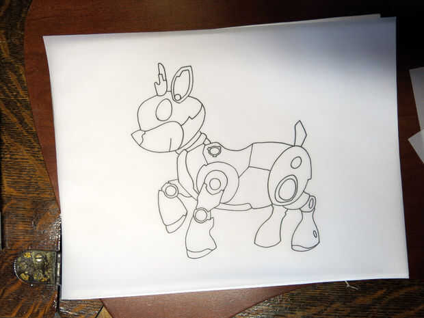 El primer paso en la construcción fue averiguar qué se parecería. Yo tachados algunos posibles formas y diseños en mi sketchbook y corrió por el diseñador de producción. Resultó que fue trasladado con uno de los doodles y fuimos adelante con ese diseño sin cambiar demasiado mucho (sobre todo los cuernos y la adición de un paquete del cohete jet en ella de nuevo). Contraté a un motor de Render 3D (Brad Rothwell, que ha presentado grandes cosas aquí en Instructables) hacer una representación de Solid Works que podría enviar a las impresoras.