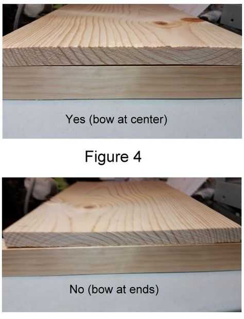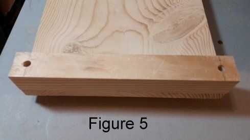 Paso 2: Cortar 8 11 1/4 de pulgada largas piezas de 2 x 2 (comprobar esta medida contra sus estantes. Algo 1 x 12 madera realmente 11 1/4 pulgadas de ancho, algunas serán 11 1/2. Corte estas piezas para que coincida con la anchura de sus estantes). Yo uso estas para apoyar a los lados de la parte inferior de cada borde de la plataforma. Ya utilicé madera estándar para los estantes, esto es importante para mantener los estantes de deformación o flexión en usted y para enderezar cualquier curva que puede estar ya allí. Aunque había usado un selecto grado de madera de los estantes todavía habría apoyado les como esta. Mida y marque 3/4 pulgadas desde el extremo de cada 2 x 2 en ambos extremos en una cara. Mida y marque el centro de la anchura de cada 2 x 2 donde intersecta con las marcas que acaba de hacer. Esto le dará punto de mira en ambos extremos de cada 2 x 2 a una cara. Utilice la guía de la espiga (o un taladro) y el brad de 3/8 de pulgada broca para taladrar un agujero profundo de 3/4 de pulgada en cada cruz de punto. Para obtener la profundidad correcta, medida 3/4 de pulgada del extremo de la broca (no incluyendo el punto de brad) y envolver un trozo de cinta de pintor todo el poco allí. Entonces cuando taladra los agujeros, parar cuando la cinta de pintor es al ras de la madera. Con los agujeros perforados en los 2 x 2 hacia el estante, encolar y sujetar los tirantes de 2 x 2 en cada extremo de cada estante y deje secar. Nota: A menos que usted compró algo de madera muy buena para los estantes, probablemente tengan un poco de un arco a lo ancho. Pegar los 2 x 2 a los estantes para que cualquier centro alto de una repisa inclinada está en el lado opuesto de los tirantes de 2 x 2. Esto forzará el arco de la plataforma al pegamento y fijarlo con la abrazadera. Vea la figura 4. Cuando haya terminado, cuatro en todos los estantes deben tener una abrazadera a cada extremo, y cada soporte debe tener dos orificios para taquetes como en la figura 5.