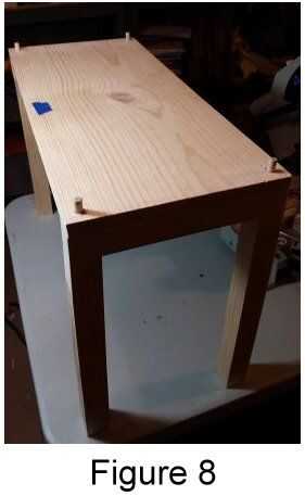 NO pegar la parte inferior de las piernas en el estante debajo de ellos. Lo que hace que este sistema de estantería modular es que los estantes no están pegados uno al otro ellos simplemente se suman los tacos en la parte superior de un estante apropiado en los orificios de la parte inferior de las patas de la plataforma por encima de ella para que la unidad es sólida y estable, pero todavía se puede desmontar en estantes separados con las piernas. Se han ahora construido tres estantes, cada uno con las piernas 15 pulgadas de largo como en la figura 8. Prémiate!