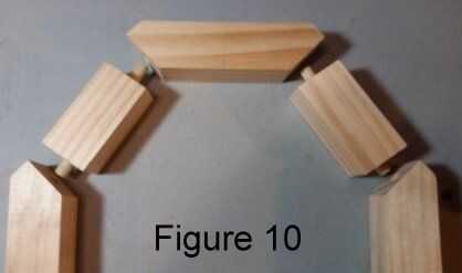 PASO 8: Corte cuatro pulgadas 3 1/8 piezas de 2 x 2. Marcar las diagonales en ambos extremos de cada pieza para determinar el centro, seguido de la pulgada de 3/8 broca para taladrar un agujero profundo de 1/2 pulgada en cada extremo de cada pieza. Únete a uno de los extremos de cada una de estas piezas a la espiga en los extremos sesgados de cada pieza del paso anterior. Pegar los restantes tacos en los agujeros en el otro extremo de las piezas a cortar.
