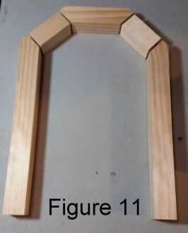 Corte dos de 7 pulgadas largos trozos de 2 x 2. Marca una línea a 3 1/2 pulgadas, luego marque una línea paralela 2 pulgadas hacia fuera a cada lado de la boya. Este da que cuatro pulgadas de largo marcado segmento centrado en la pieza. Desde cada extremo de este segmento de cuatro pulgadas, utilice un transportador para marcar un ángulo de 45 grados hacia afuera hacia los extremos de esta pieza. Cortar con una sierra para cortar ingletes o una sierra de mesa en este ángulo. Como en el paso 7, marque una línea a 1 1/2 pulgadas cada una de las caras recién cortadas para darle un 1 1/2 pulgada cuadrado marcado en la cara angulada. También como en el paso 7, marcar un ángulo de 90 grados de esta plaza y cortar. Figuras 10 y 11 se muestran todas estas piezas presentadas juntos en caso de cualquier confusión. Trace diagonales a través de cada extremo de las caras angulosas y perfore un agujero de 1/2 pulgada profundo con la broca de 3/8 pulgada. Pegue una espiga que sobresale de la pulgada de 3 1/8 pedazos en cada uno de los agujeros que sólo por lo que han hecho dos formas U de cada una de estas piezas y las piezas cortas, unido a las piernas más largas. Ahora puede insertar los pedazos más largos de la pierna en los tacos de su estante superior (no pegar en el estante) y fijar todo en su lugar para secar.