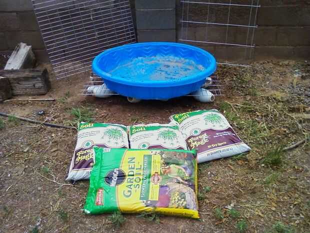 Construir tres jardines levantados usando una mezcla del encapsulamiento de suelos y mezcla de plantas Miracle Grow. Luego una patada en la masa cerebral e incorporaron bolos mi diseño.