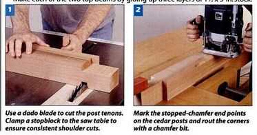 Luego montar el segundo rayo de la misma manera. Hacer una plantilla para la forma final de las vigas principales y traza la forma sobre las vigas. Utilice una sierra para cortar los extremos de la viga. Siga el mismo procedimiento para los extremos de la camilla. Extienda las muescas a lo largo de los bordes inferiores de los tirantes y utilizar un disco de moldurar para hacer los cortes. Diámetro agujeros piloto y Avellanadores en una sola operación con un poco de la combinación del enchufe. A continuación, fije los travesaños a las vigas con tornillos (Foto 5). Use un cortador del enchufe en el taladro para hacer tapones e instalarlos sobre los tornillos. Cuando el pegamento se seca en los tapones, les corte y les pare al ras con un formón afilado.