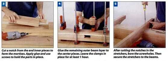 Hacer cada una de las dos vigas principales pegando tres capas de 11⁄2 x 5-pulgadas stock. Para evitar cortar mortajas tradicionales para las espigas de poste, hacer cada capa centro de tres piezas separadas como se muestra en la ilustración de la pág. 124. Corte una muesca en cada segmento de viga final interior para formar las mortajas en vigas ensambladas. Aplique el pegamento a las caras de acoplamiento para una viga, luego coloque el centro en uno de los tableros exteriores. Utilice tornillos para mantener las piezas del cambio (Foto 3). Colocar la tercera capa en posición y pinza (foto 4).