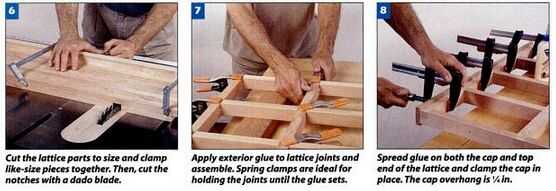 Coloque todas las piezas de uno de los enrejados y unte pegamento en las articulaciones. Montar el marco y aplique las abrazaderas de muelle para cada empalme de regazo de media (foto 7). Cuando termines, comparar mediciones diagonal opuestas en esta cuadrícula para asegurarse de que la Asamblea es cuadrada. Con ambos marcos construidos, cortar las tapas a la medida y Bisele los bordes superiores. Unte pegamento en el extremo superior de cada enrejado y en su tapa, a continuación, sujete las piezas juntas (Foto 8). Poner un puesto en la mesa de trabajo y uno de los marcos de posición en él. Marca y diámetro tornillo agujeros en el poste. Fijar la rejilla al poste con tornillos de latón. Atornille el poste opuesto al bastidor y repita el procedimiento para el otro lado de la rejilla.