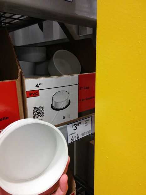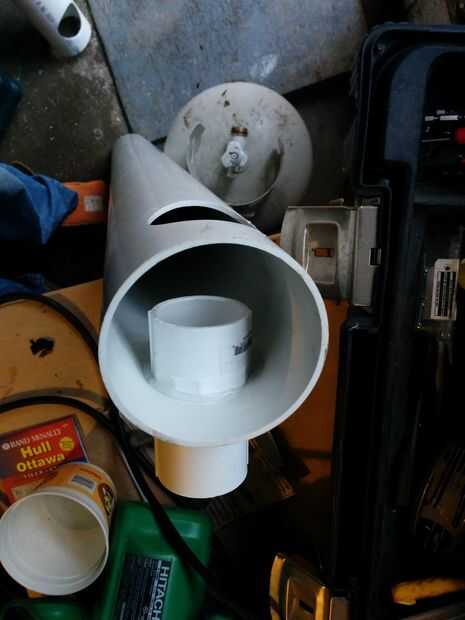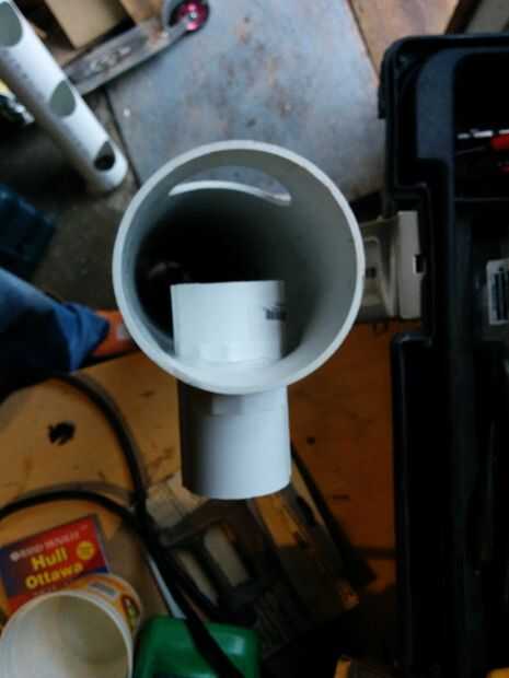 - Cortar un agujero grande bastante para caber una de 1.5" de rosca totalmente a través de adaptador de PVC como al extremo del tubo como usted puede, pero sigue dejando espacio para un adaptador de limpieza que se unirá al lado de él en el extremo - sobre una brecha de 3 pulgadas.