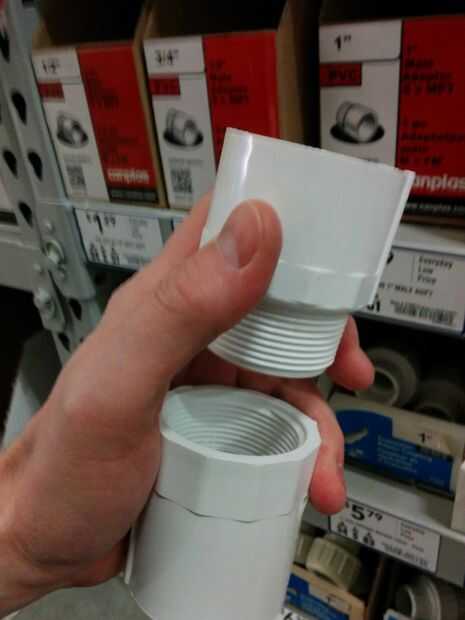 - Es necesario tener la hembra y macho extremos de los adaptadores de PVC de 1.5" de atornillar firmemente, intercalando el área plana hecha en el tubo de 4". Para ello, tuve que cortar algunos de los hilos del adaptador.