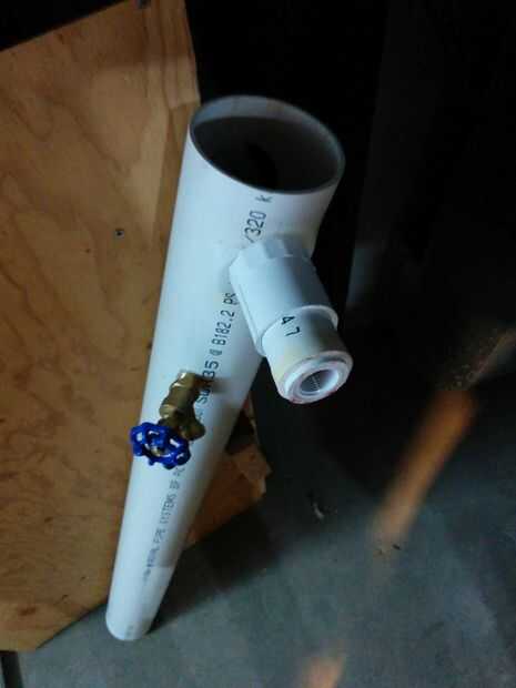- Instale la válvula de cobre amarillo en el agujero pequeño temporalmente y tratando de mantener por rosca en el interior del tubo. Es necesario drenar el agua, por lo que no quiere tener un labio dentro del tubo. En este punto es sólo para ayudar a la posición de las tuberías, pero es demasiado frágil para intentar sellar permanentemente por ahora.