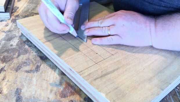 Para el diseño de las manillas primero encontré el punto central de la izquierda y derecha juntas. Desde el centro I mide 3 pulgadas en cada dirección, las 2 líneas marcadas, había medido hacia abajo de 4 pulgadas desde la parte superior y marcó una línea a través de la Junta, había medida 2 pulgadas hacia abajo desde la parte superior y había marcado otra línea a través de.
