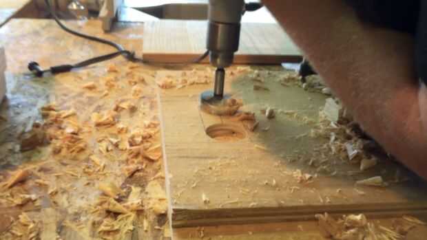 Utilizar una pieza Forstner de 2 pulgadas perforar 2 agujeros en cada tablero en los puntos de 2 centro he marcado en el rectángulo que 1 pulgada en el extremo.