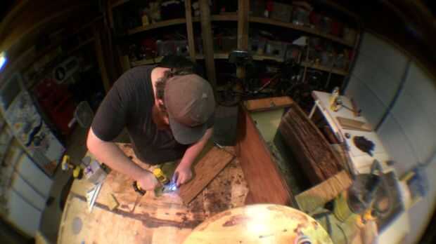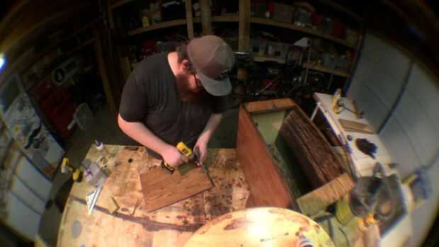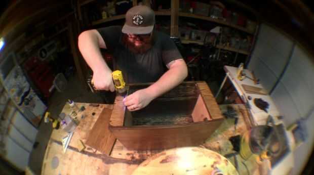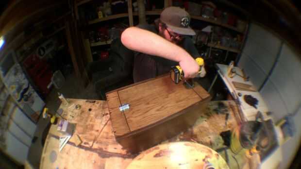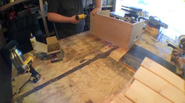 Para el montaje de la caja usé tornillos de madera y pegamento de ponerlo todo junto. Empecé por pegar y atornillar uno de los lados con las asas a la pieza superior, entonces puse en la parte de atrás, al otro lado con el mango, las piezas de dos 4 pulgadas en la parte delantera, y luego le puse el fondo.