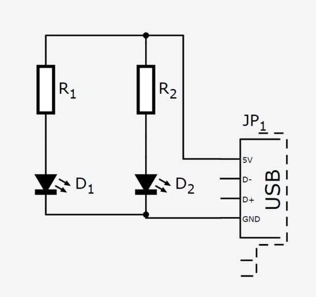 Conecte el circuito a una computadora. Usando un medidor multi, compruebe que el cable se conecta a la placa de circuito para el cable de positivo y negativo. Usted debe obtener una lectura de 5V aproximadamente. Soldar un cable a cada una de las conexiones. Conectarse un LED y 100 Ohm resistencia de cada alambre de las resistencias no son en la foto (ver esquema). Se agregaron después de uno de los LEDs quemados]