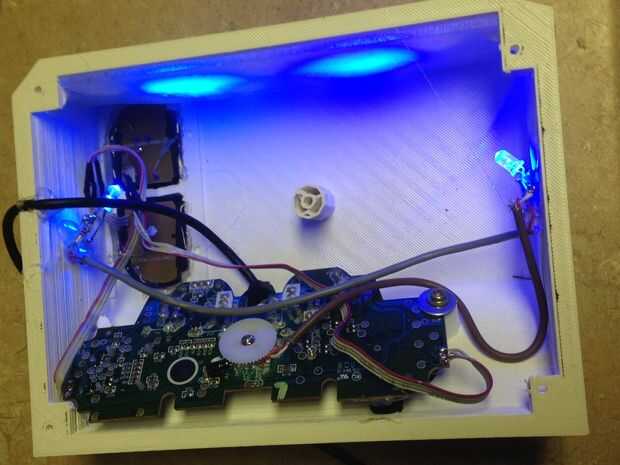 Esto use los mismos agujeros que la placa fue conectada originalmente con. Con tres tornillos y tres arandelas, (sólo dos de cada uno están en la foto) Asegure el tablero del circuito al gabinete. Pegamento caliente los LEDs para que la luz se extiende sobre el plexiglás.