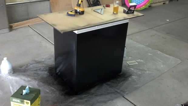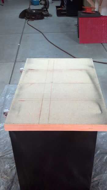 corté un pedazo de MDF a han de 4" de la proyección. Pegaron y atornillaron un recorte en la parte inferior del MDF. Utilicé tiras de listón de 1,5 "x 1/2". Después de fijar el MDF en la parte superior de la tapa con tornillos comencé a maquetar la torre con una línea de tiza a mí y la idea del tamaño que quería ir con.