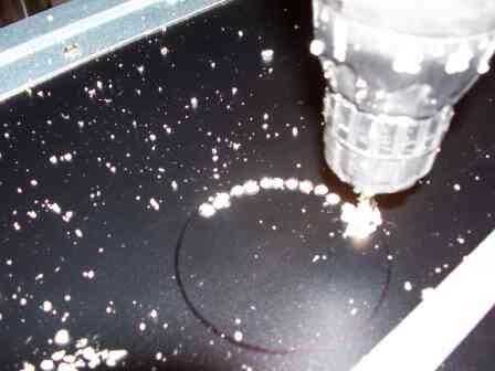 Perforar una serie de agujeros dentro del círculo, asegurándose que los orificios recorrer todo el camino en el interior si la nevera. Nota: Una alternativa a una serie de agujeros de perforación y corte con una herramienta giratoria es utilizar un agujero de 3" sierra. Observe otra vez la línea de la cinta que marca la línea de refrigerante. No corte o perfore allí!