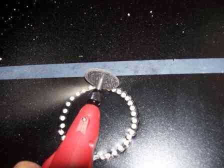 Uso una herramienta de corte rotatorio o un par de tenazas para cortar el metal a la izquierda entre los agujeros. Observe otra vez la línea de la cinta que marca la línea de refrigerante. No corte o perfore allí!