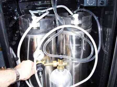Colocar los barriles, tanque de CO2 y regulador de nuevo dentro del barril y conectar la cerveza y CO2 se desconecta en los barriletes de Cornelius.