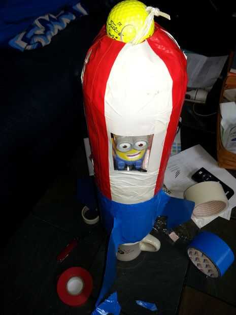 1. Se utilizan 2 botellas de 2 litros para la mayoría de nuestros cohetes. Ponga una botella boca abajo, que es la boquilla que te llenan de agua y aire. Cortar la otra botella en dos trozos y usa tu imaginación para la forma y dimensión de la sección superior... en general, aunque llenan con algunos contrapesos y espuma y luego cinta adhesiva en la parte inferior media. Puede parecer contra intuitivo que el centro de gravedad del cohete debe ser hacia la mitad superior del cohete, pero contrapesos son verdaderamente necesarias (consulte el documento pdf en el enlace arriba para detalis)