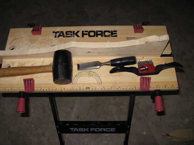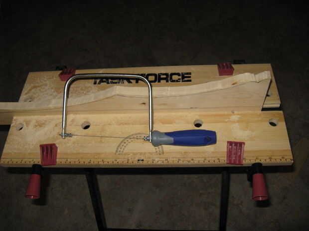 Abrazadera de la Junta en una prensa de tornillo boca abajo así que usted puede cortar la mayor parte de los residuos con una sierra de marquetería. Esta parte debe realizarse con paciencia extra. Haste hace residuos. Después de cortar la mayor parte de los residuos dejando sólo 1/8" van detrás en los bordes con un 1" Banco cincel y un martillo. Después de que los bordes se acaban te puede tanto continuar con el cincel si no tienes un spokeshave o puede utilizar el spokeshave. Debo confesar no he usado un spokeshave antes pero me pareció que muy agradable. Deja un resultado muy suave y maneja estas curvas maravillosamente! Si no tienes un spokeshave conseguir uno :-)